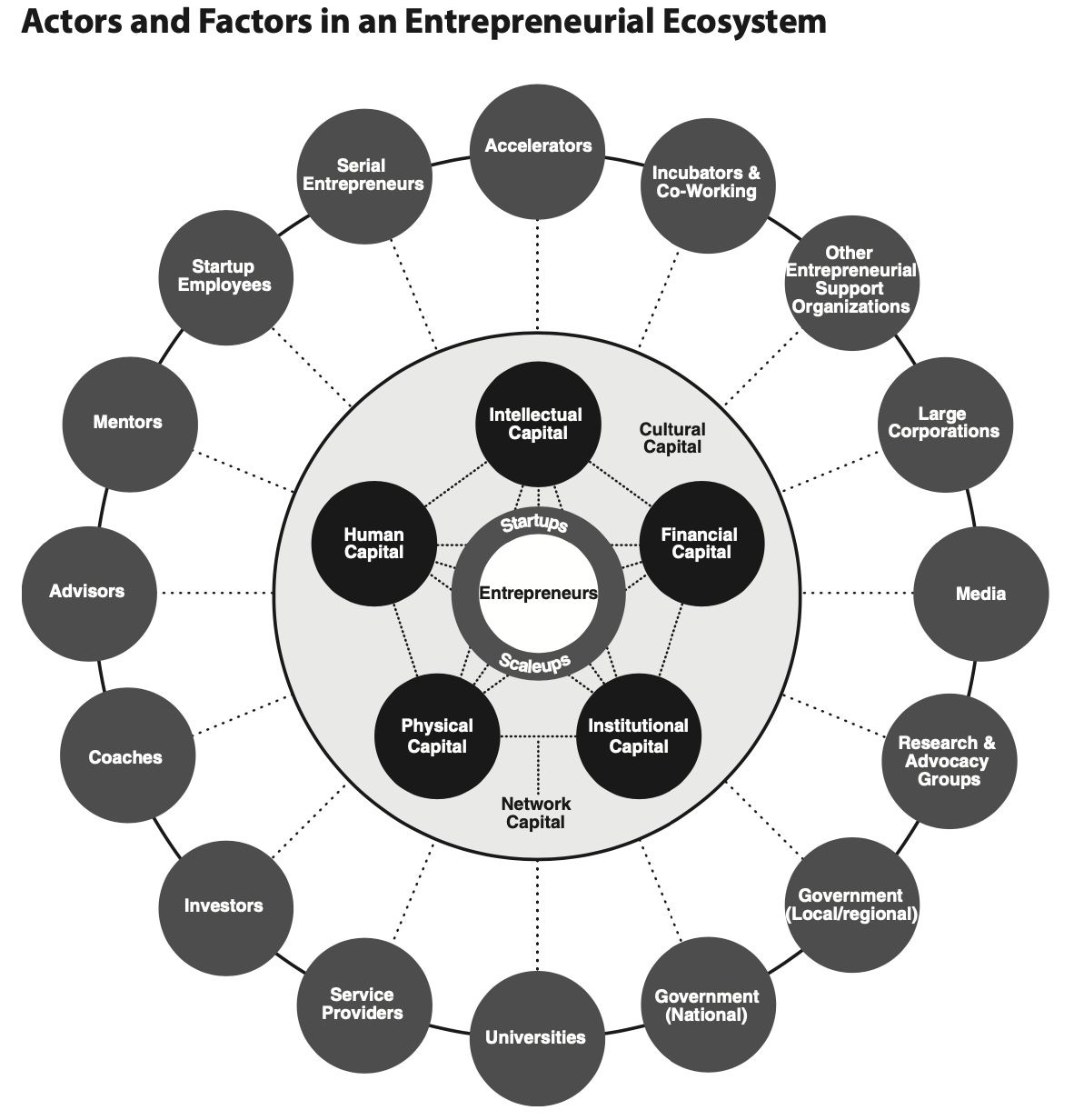 Entrepreneurs are in the middle. Around them at the first level, you have human capital, intellectual capital, financial capital, institutional capital, and physical capital. All of that is called ācultural and network capital.ā